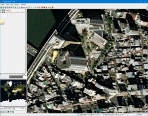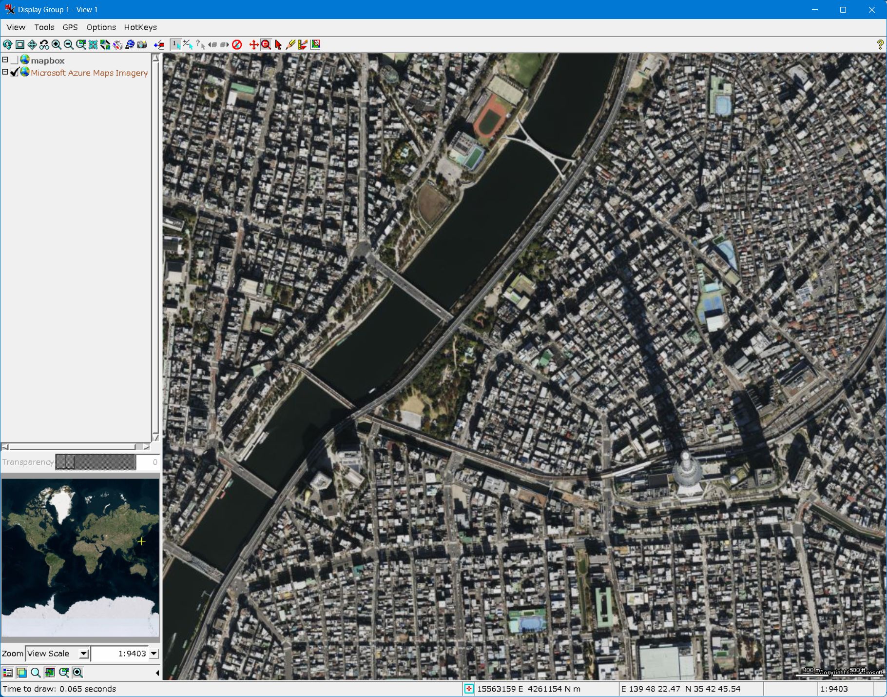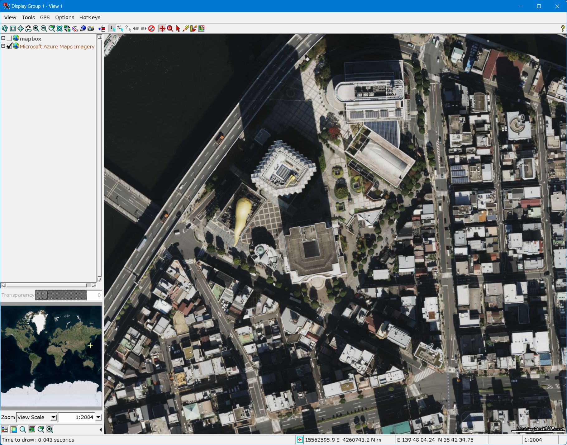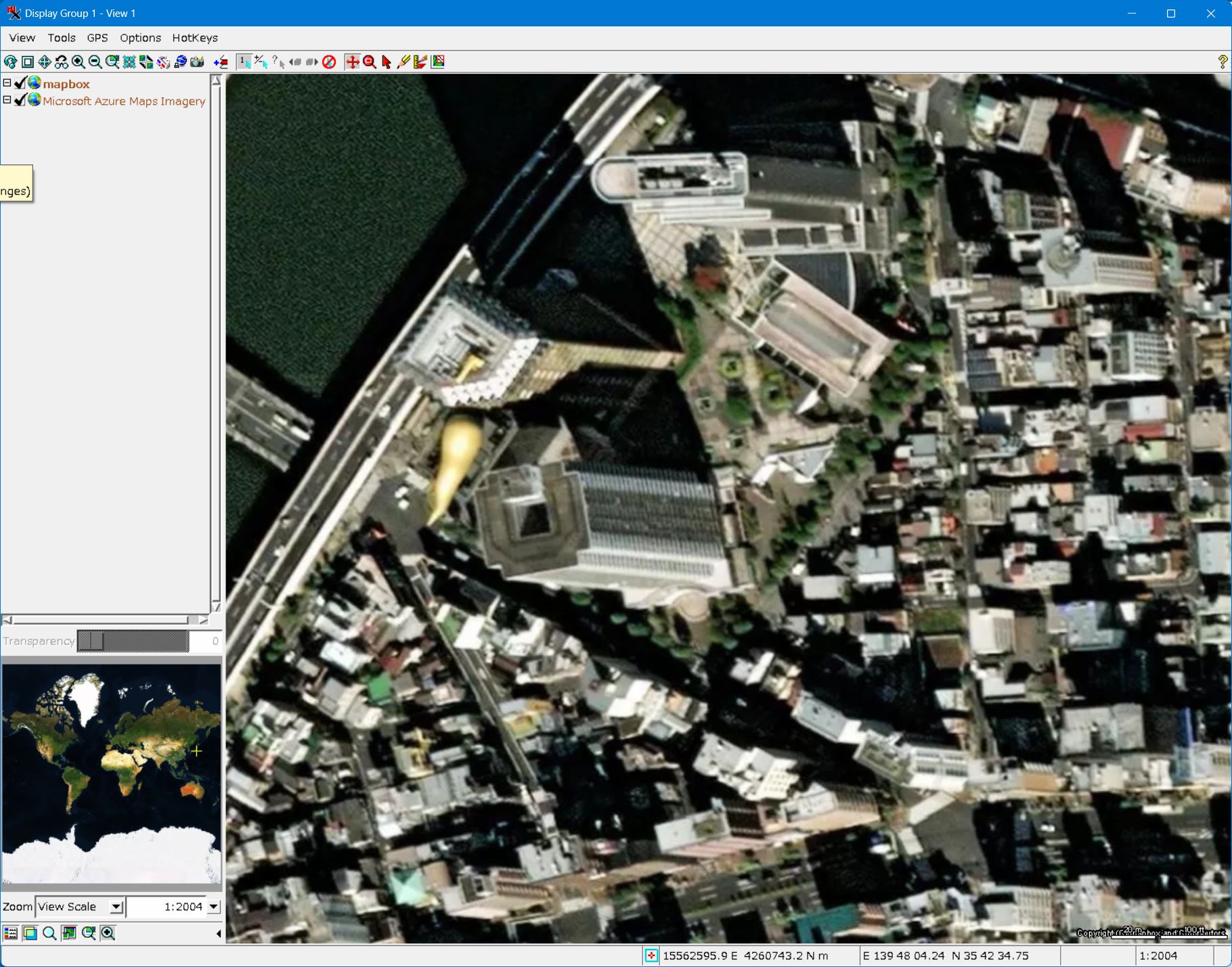 - もっと拡大してみました。黄色いオブジェはアサヒビールです。横に首都高が走っていて、その左が隅田川です。Azure Mapsの方の画像はオルソ補正がされているようです。画像的にもシャープです。