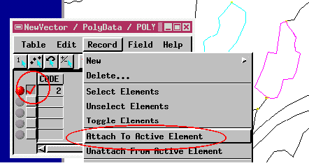 6.すでに存在するレコードを他のポリゴンに付与したい時は、View All Recordsボタンを押し、そのポリゴンを選択し、付与するレコードの前のチェックボックスを押し、RecordメニューからAttach to Active Elementを選びます。