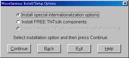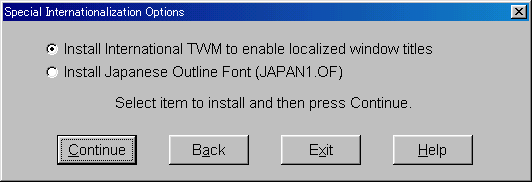 3.下図で上のボタン(TWMのインストール)を押し、Continueボタン。次に同じウィンドウに戻ってから、下のボタン(JAPAN1.OF)を選び、Continueボタンを押す。