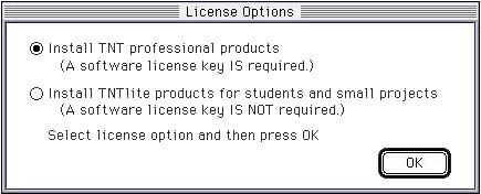 3.License Optionsと題したウィンドウが現れます。Install TNT Professional Productsの前のラジオボタンを押されているのを確認して、OKボタンを押します。