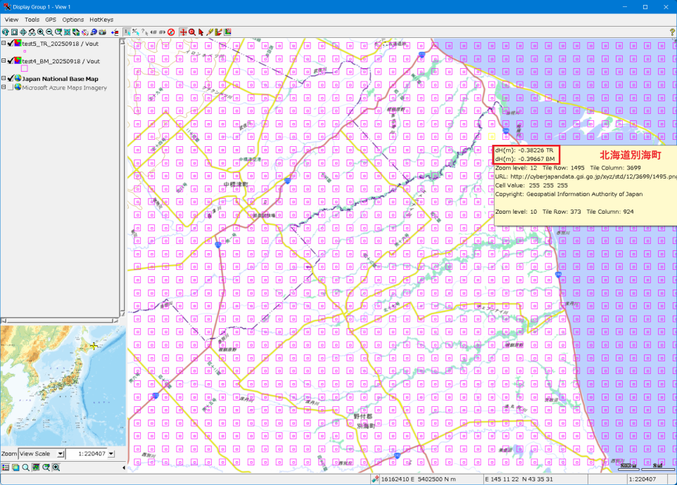 最大値がどこかの確認はしていませんが、調べた地点における三角点(TR)のパラメータファイルの補正値は-0.68776(m)でした。上記の記述と調和的です。また、水準点(BM)のパラメータファイルの補正値は-0.29594(m)ですので、水準点の補正量の方が小さいことが分かります。 - 図3)北海道別海町