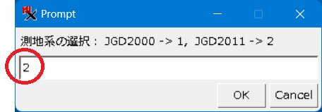 - 次に、測地系を指定します。ここでは、2番の"JGD2011"を選択しました。