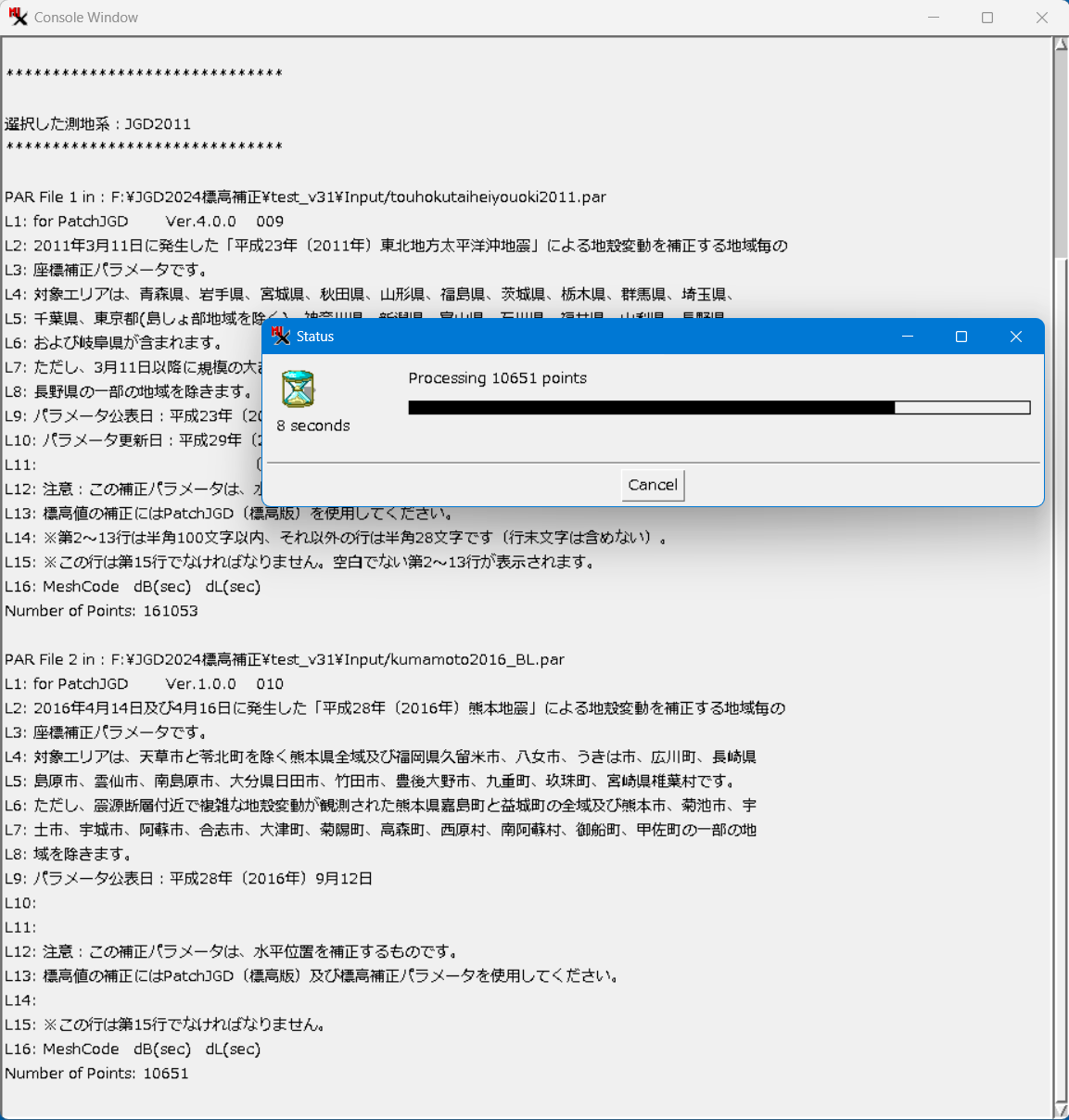- 順次、座標・標高パラメータファイルの処理が開始され、各ファイル毎に進捗を表すステータスバーが表示されます。
