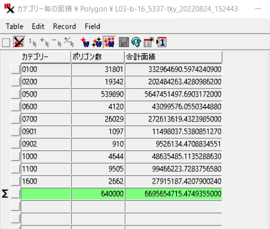 - コピーしたベクターのポリゴンデータベースに集計結果のテーブルを作るようにした。