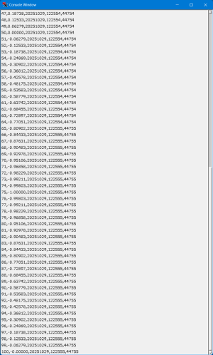 - 計算が始まり、v1 と同じく、コンソール画面に正弦波の1周期(360度)を500等分した時の Sin の値が表示されます。