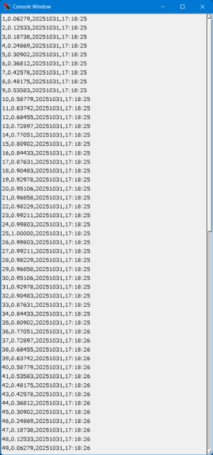 - コンソール画面には、例として正弦波の1周期(360度)を100等分して、その時の Sin の値が表示されています。(処理は以上で終了)