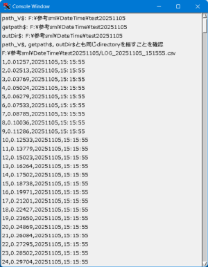 - 先に指定したディレクトリに、LOG_(今日の年月日)_(時分秒).csv という名前の CSV ファイルが自動生成されます。内容は、コンソール画面と同じ)。v1(v11) のように、コンソール画面上で別名保存 (Save As) する必要はありません。