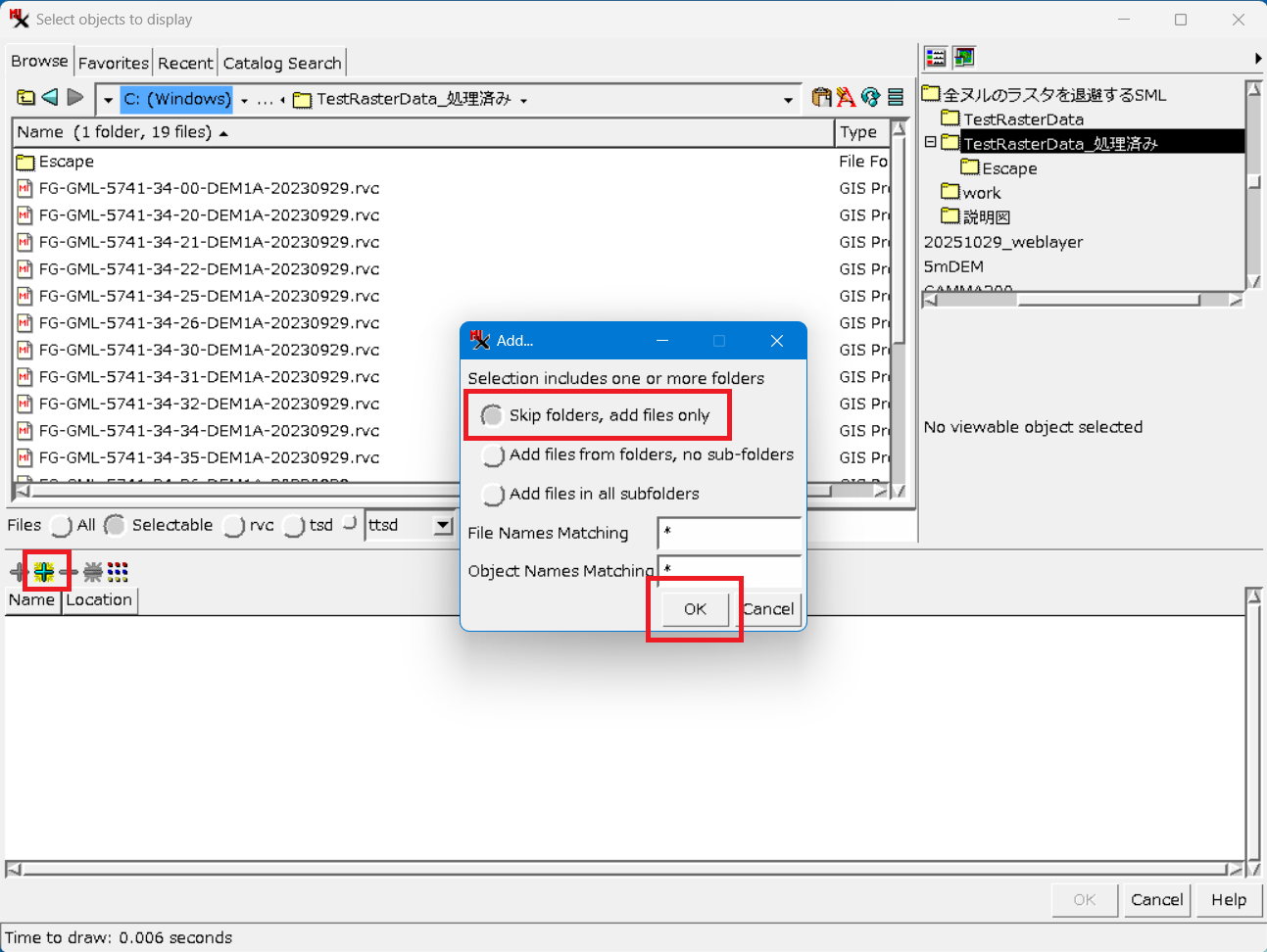 - オブジェクト選択ウィンドウでは、一番上の「Skip folders, add Files only」を選ぶと、サブフォルダー(Escape フォルダー)内の RVC は選択されずに、直下の RVC ファイルのみが選択されます。