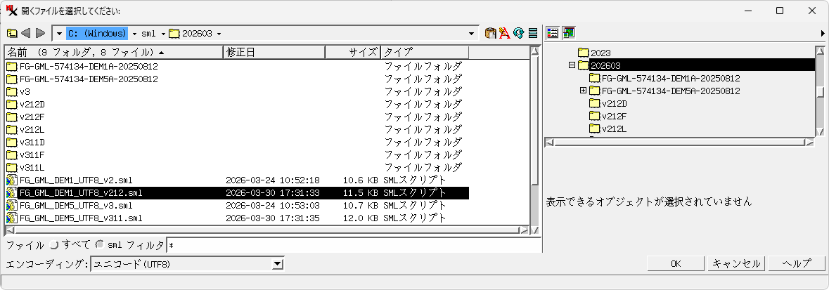 - SML スクリプト用のファイルを選択、エンコーディングを UTF8 へ変更し、[OK] ボタンを押します。