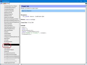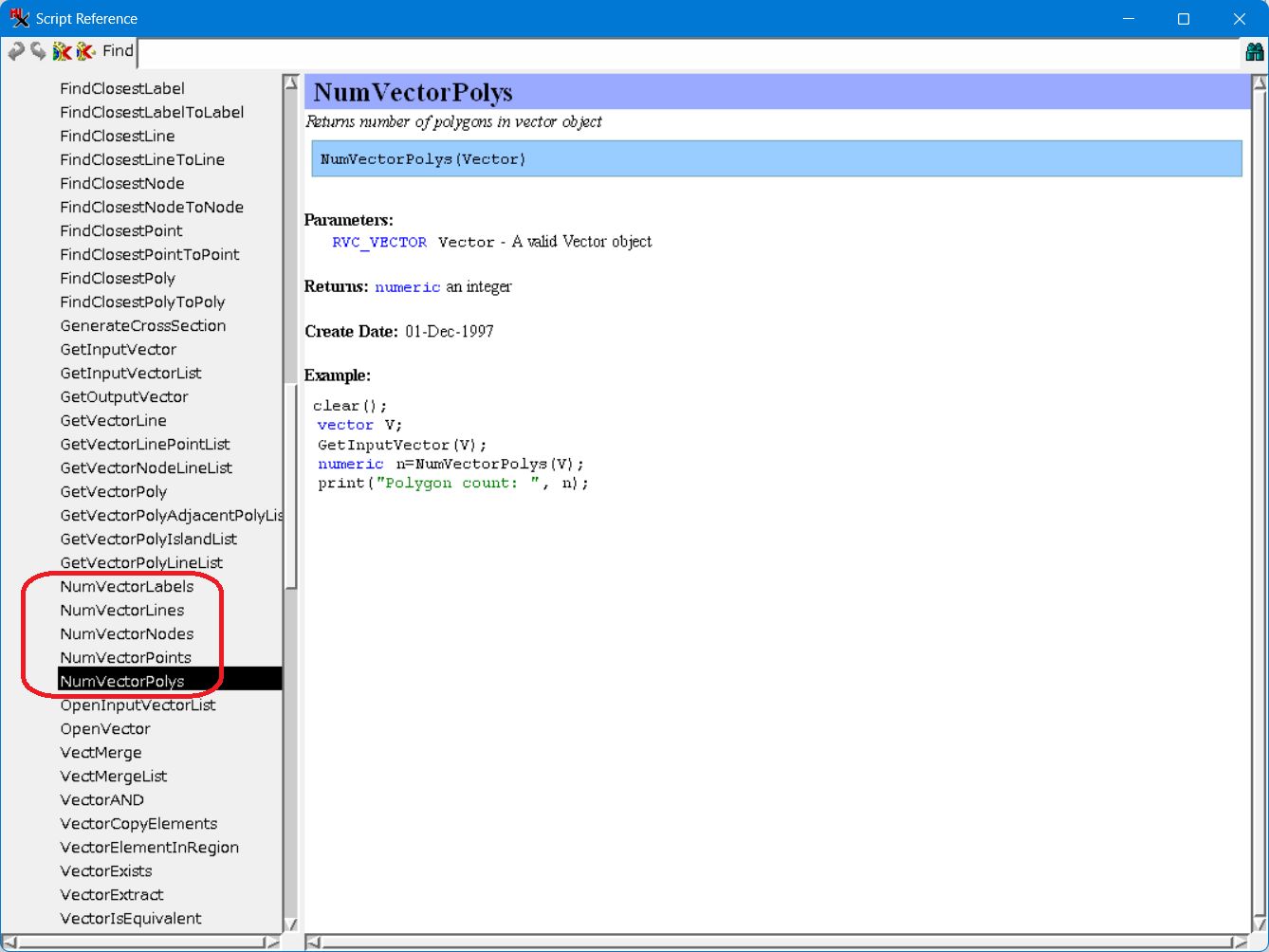 - 下にスクロールする。NumVectorPolys、NumVectorPoints などの計数関係のコマンドが並んでいます。ここから自分が必要とする関数を選びます。