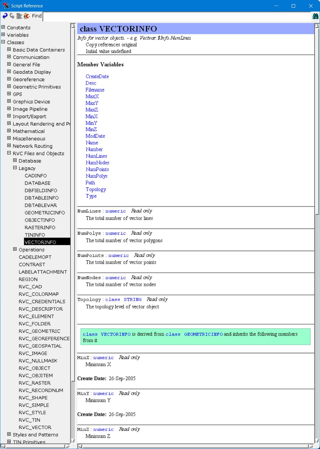 一番上に、$Info : class VECTORINFO Read only The info object. See VECTORINFO.