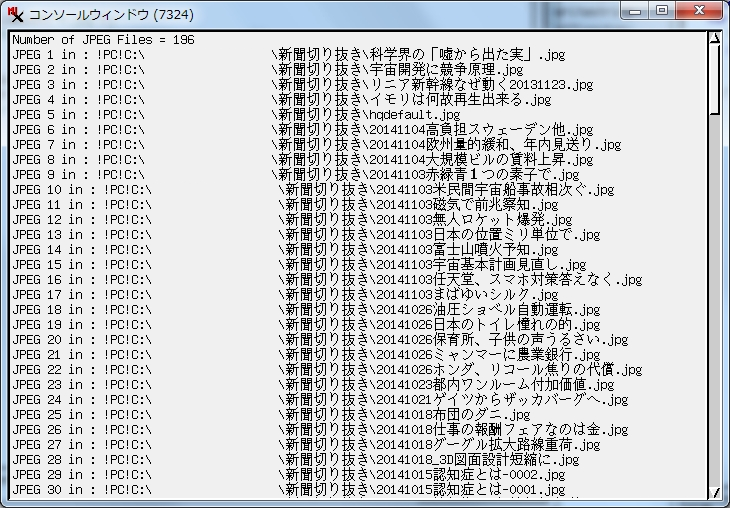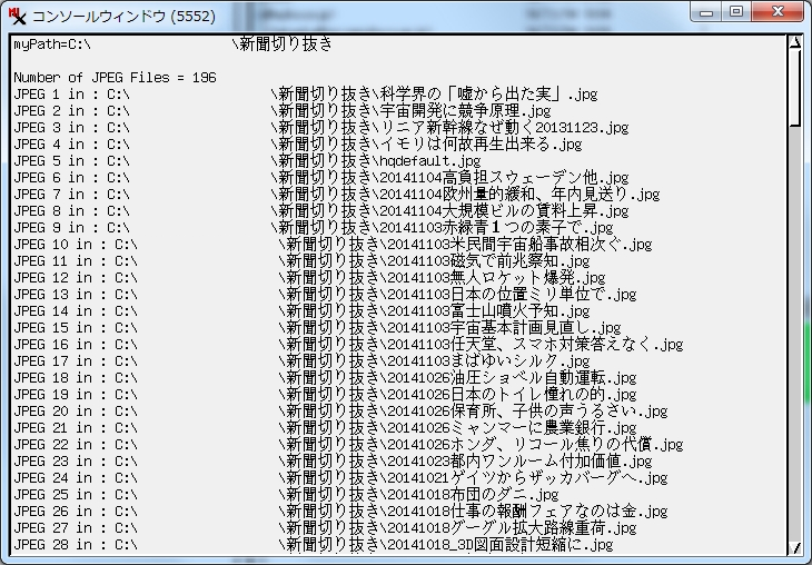- コンソールに、フォルダー中の jpg ファイルの全個数およびファイルリストがフルパスで表示される。
