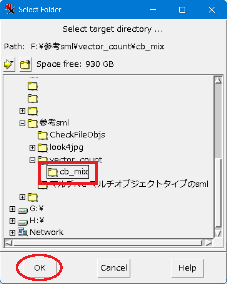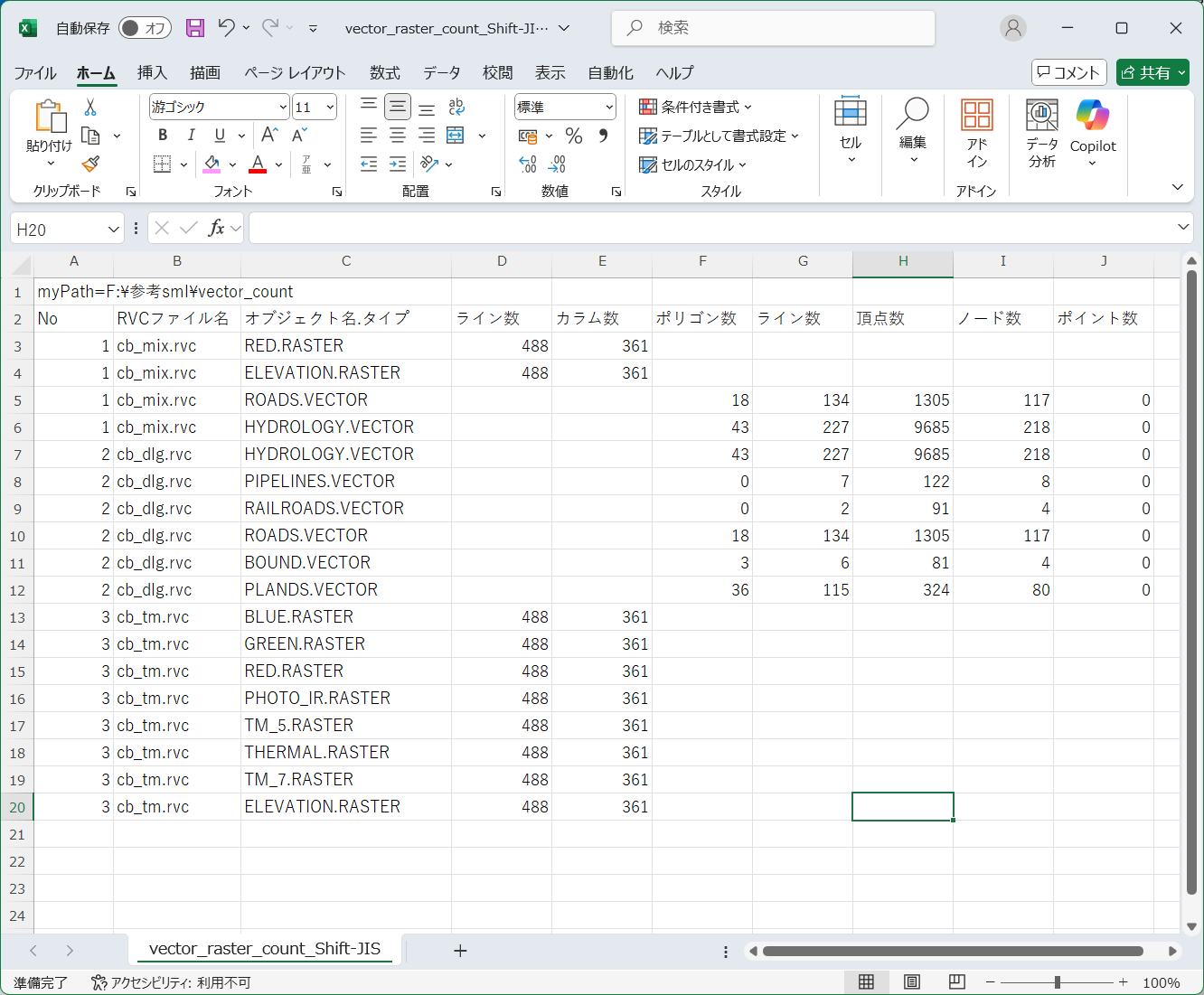 - そのほか、はじめに選択したフォルダー内に、同様の内容の CSV ファイルが出力されます。ファイル名は、"vector_raster_count_Shift-JIS.csv"
