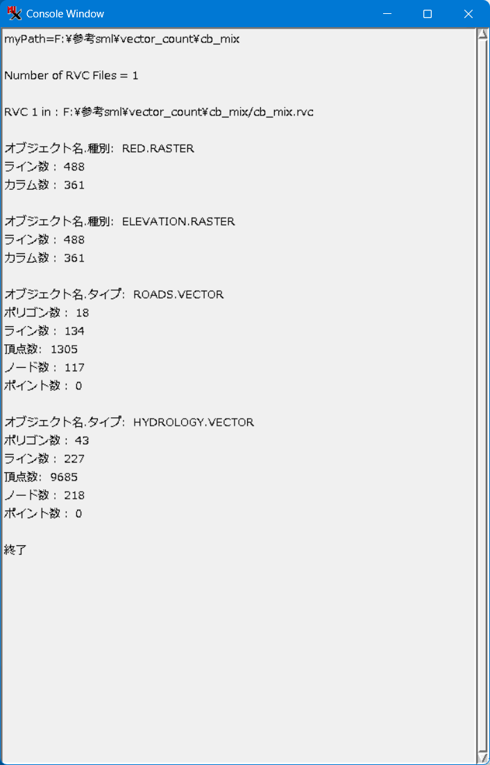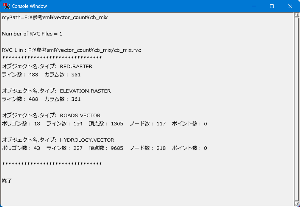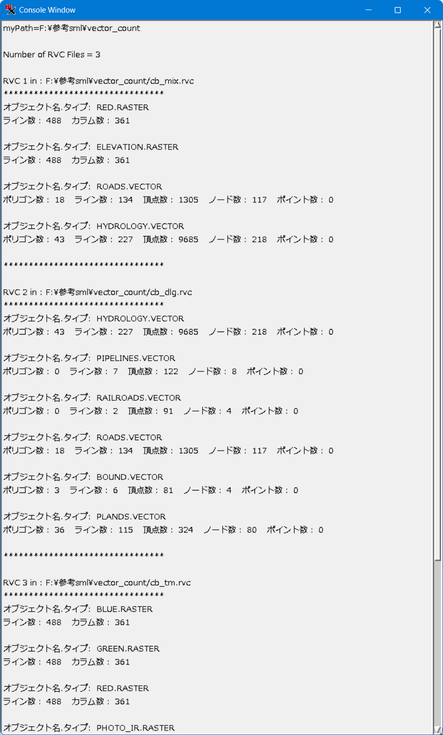 - これまで通り、コンソール画面に、フォルダー内の RVC ファイル(複数可)の中のラスター、ベクターオブジェクトの基本統計量が表示されます。