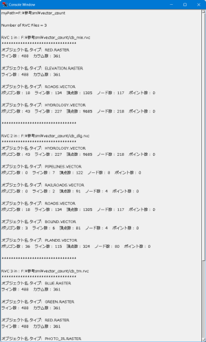 - これまで通り、コンソール画面に、フォルダー内のRVCファイル(複数可)の中のラスター、ベクターオブジェクトの基本統計量が表示されます。