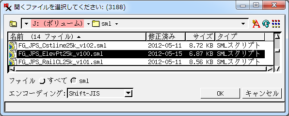 ダウンロードしました SML スクリプト用のファイルを選択、エンコーディングを Shift-JIS へ変更し、[OK] ボタンを押します。