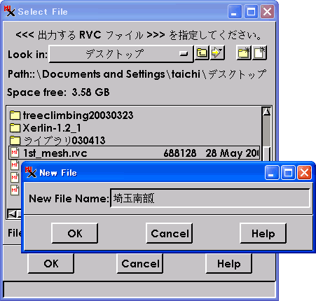先ほどと同じようなウィンドウが現れますが、今度は出力ファイルの指定です。ファイルを保存する場所まで移動して、右上の New File ボタンを押し、ファイル名を入力します。入力できましたら OK ボタンを押しましょう。