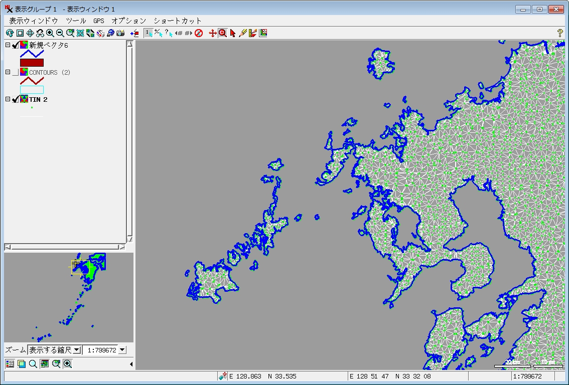 このような加工処理して単純化した擬似的海岸線ベクタデータを使って、TINを 作成します。