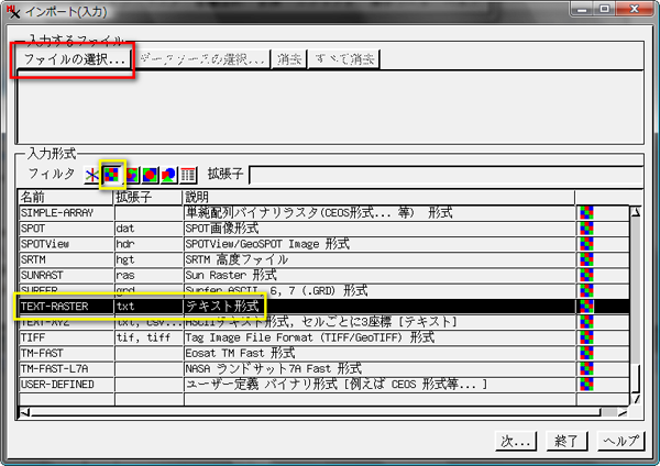 ▼<オブジェクトのジオリファレンス処理>ウィンドウの[ファイル]>[開く...]から、先ほどインポートしたDemデータを開きます。