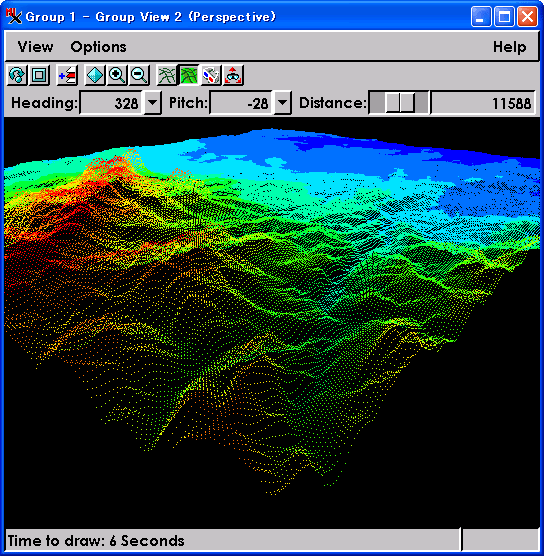 ラスタの値は、高さ(Z値)として与えられますので、DEM ラスタであれば、 3次元のポイントデータに、衛星画像であれば、DN 値を高さとして表現 するポイントデータになります。