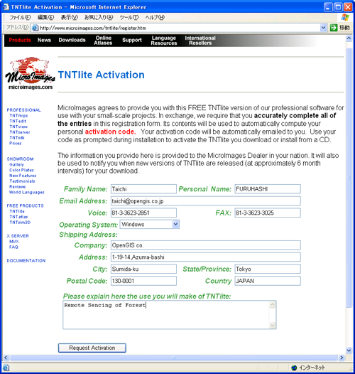 ??? ??? これは、ver6.8 から本格的に導入される、ライセンス管理システムです。 ??? 次期 TNTmips からは、TNTlite として利用する際には、 ??? このアクティベーションコードを必要とします。 ??? ??? ??? ??? 入力ウィンドウが現れましたら、右下の Register... ボタンを押しまして、 ??? マイクロイメージ社の登録サイトへアクセスしましょう。 ??? [サイトアドレス