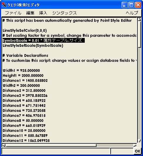 ● 作業(3): 『スクリプトを書き換えて属性を反映』 ▽さあ、いよいよ今回の山場です。今度は先ほどのスクリプトをいじって みましょう。再度 <グループコントロール> ウィンドウのメニューより [レイヤ]-[コントロ−ル...] を選択します。 ▽<ベクタレイヤ コントロール> ウィンドウの [ポイント] タブへ移動 します。 ▽スタイル: 欄の [指定...] ボタンをクリックします。ここまでは先ほど と一緒ですね。 ▽<クエリ(検索)エディタ> が立ち上がりましたら、その中から、 SymbolScale = 0.01 という行を探し出します。0.01 という値が別の値でもかまいません。 この部分が、マークの大きさを定義している値になります。つまり、 この値を大きくすれば、マークは大きく描かれますし、小さくすれば マークも小さく描画されます。 ▽この行を次のように書き加えてみましょう。 SymbolScale = 0.01 * 属性テーブル.サイズ 右側の "属性テーブル.サイズ" というところは、テーブル名.フィール ド名を具体的に示したものですので、ユーザさまによって表記が変わっ てきます。今回はサンプルデータに従って "属性テーブル.サイズ" と 表記しました。