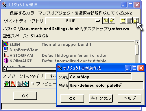▽同じく <カラーパレットエディタ> ウィンドウのメニューより、[ファ イル]-[保存] を選び、表示しているラスタオブジェクト(今回の場合は BLUE)の下の階層へ移動して、ColorMap という名前のカラーマップを 保存しましょう。この保存場所がわかりにくいですので注意してくだ さいね。保存するオブジェクト名を入力する場合は、右上の [新規オ ブジェクト] ボタンをクリックします。