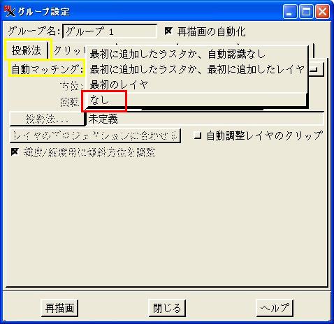 ▼「グループ設定」ウィンドウの「投影法」パネルで、「自動マッチン グ」を"なし"にします。