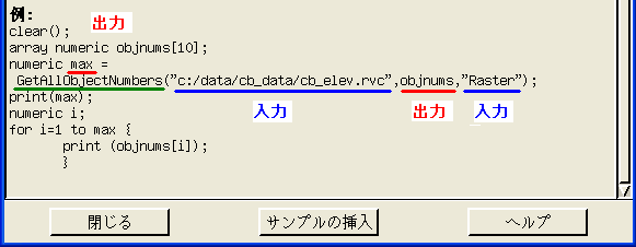 RVCファイル名と選択するオブジェクトタイプ("Raster")を、入力として 与えます。ファイル中にある各ラスタオブジェクトにはそれぞれ内部番 号が付けられていて、それをobjnums 変数で返してきします(出力)。含 まれるラスタの数(max)が左辺に出力されます。 ▽ 作成したスクリプト # 2. Get Object number array numeric objnums[100]; numeric max = GetAllObjectNumbers(infile$, objnums,"Raster"); print("max=", max); とりあえず、RVC中にあるラスタ数は最大100としました。もっと大きい 場合は増やしてください。 3)最後の部分です。 説明のため、使用するスクリプトを先にお見せします。 ▽ 作成したスクリプト 1 # 3. Delete Metadata 2 raster Rvar; 3 numeric i; 4 for i=1 to max { 5 print (objnums[i]); 6 string objname$ = GetObjectName(infile$, objnums[i]); 7 print(objname$); 8 9 OpenRaster(Rvar, infile$, objname$); 10 11 DeleteSubobjects(Rvar, "METADT"); 12 13 CloseRaster(Rvar); 14 } 3行目 iを数値であると宣言しています。 4行目 i をラスタ数(max)だけループします。 5行目 確認のため、オブジェクト番号(objnums)をprintしています。 6行目 オブジェクト番号(objnums)を使ってオブジェクト名(objname$) をもらいます。GetObjectName関数もオブジェクト関数です。 ★9行目 このようにして得たRVCファイル中のラスタオブジェクトを、 OpenRaster関数を使ってラスタ変数に結び付けています。 11行目 目的の処理を実行します。 13行目 処理を終えたラスタは閉じます。 4)最後にFinishメッセージです。 ▽ 作成したスクリプト # 4. Finish message PopupMessage("Finished !!"); 完成したSMLです。