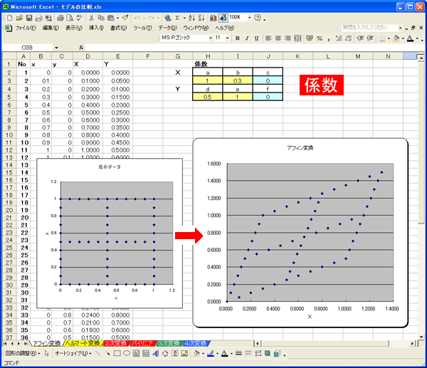 図中、色のついたセルが変換の係数です。係数の値を変えると形が変わ