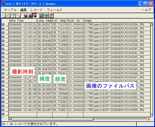▼ テーブルが開きます。全レコード表示します。画像の撮影時刻を基に