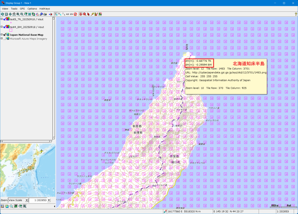 最大値がどこかの確認はしていませんが、調べた地点における三角点(TRiangle)のパラメータファイルの補正値は0.52969(m)、水準点(BenchMark)のパラメータファイルの補正値は0.23065(m)です。上記の記述とほぼ同様の大きさです。 - 図2)北海道知床半島