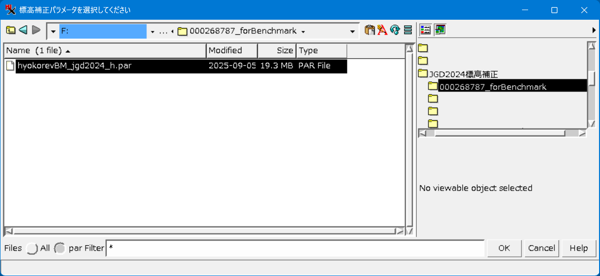 https://www.gsi.go.jp/sokuchikijun/sokuchikijun41012.html#hyokorev2024 - 実行を開始すると、最初に標高補正パラメータの選択を求められるので、上記ファイルを選択します。