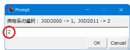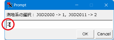 - 次に、測地系を指定します。ここでは、2番の"JGD2011"を選択しました。