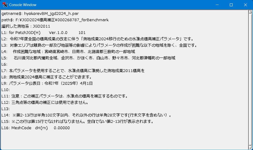 - 読み込むパラメータファイルは、測地成果2024移行のための水準点標高補正[ZIP形式:3.35MB]を使用しました。