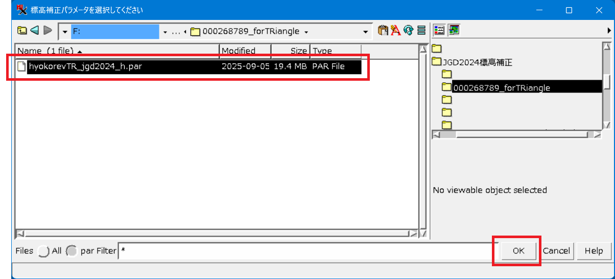 - 読み込むパラメータファイルは、測地成果2024移行のための三角点標高補正[ZIP形式:3.53MB]を使用しました。