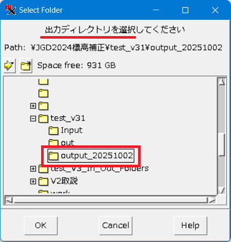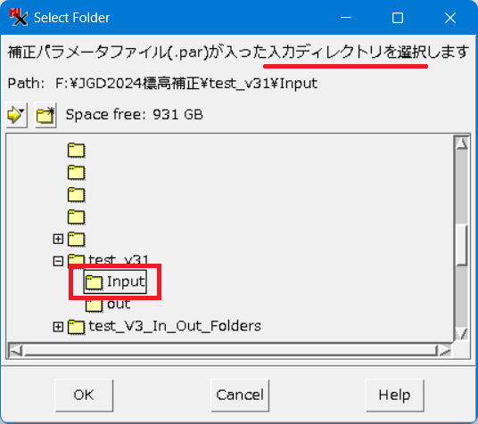 - 実行を開始すると、最初に座標・標高補正パラメータファイルが格納されたフォルダーの選択を求められるので、該当するフォルダーを選択します。