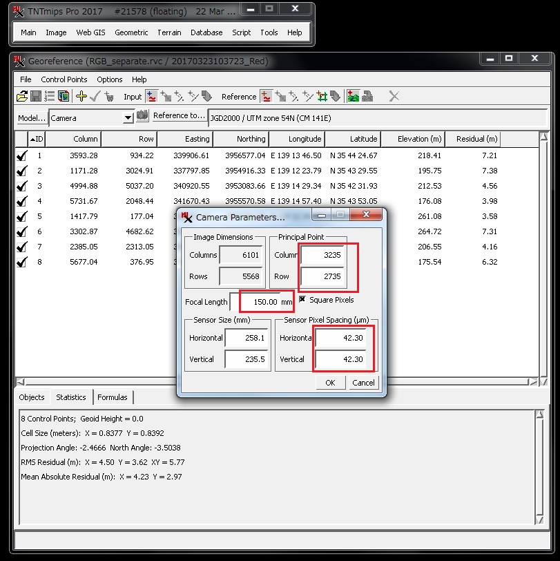 Camera Parameter の画面が出ますので、あらかじめ調べておいたカメラ直下の場所(主点)のライン-カラム、
