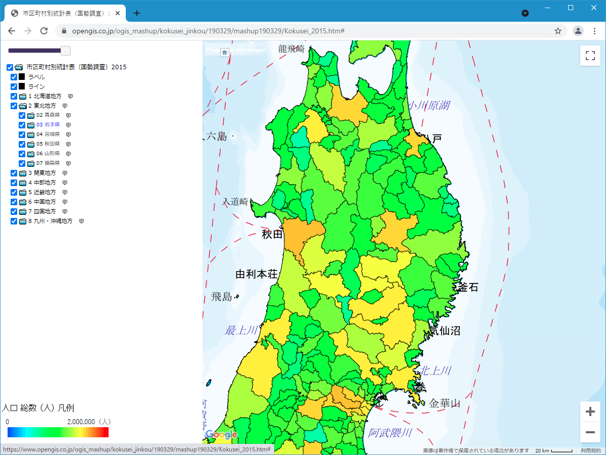 - ポリゴンの色は、表中の人口総数の数値に基づいて色塗りをしています。サイドバー下の凡例をクリックすると、別ページに詳細な凡例を表示します。