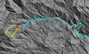 流水解析や集水解析で使用する用語。標高ラスタの上で流出口(シードポイント)を与えると、その点の集水域とそこから流れる流路が求められます。 |